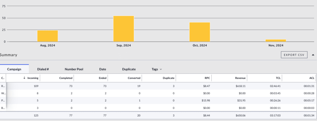 - Aug–Oct 2024: $650.06 from 125 calls (20 conversions).