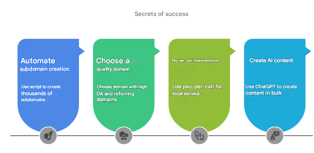 ) to rank for local keywords like “plumber in [city].” Sudhrana wrote a custom script to fully automate the process, from creating subdomains and generating content to submitting URLs to Google.